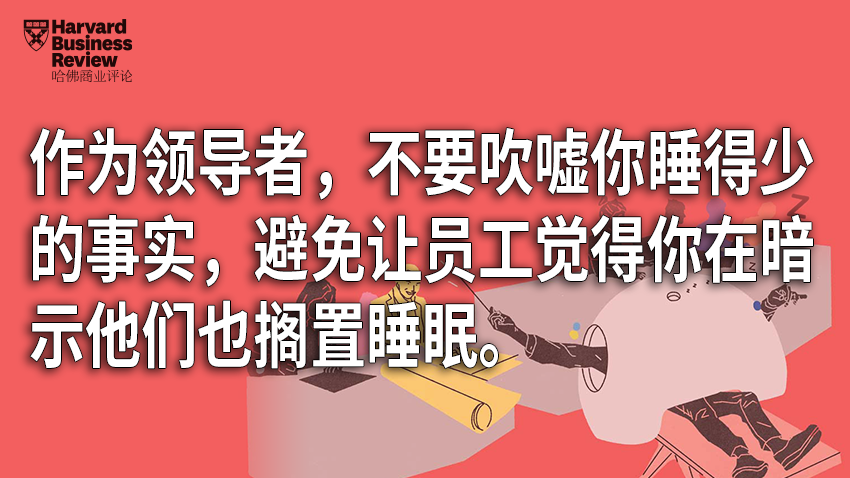 领导可以通过“榜样的力量”达到这种效果(例如,吹嘘自己仅睡4小时或者在凌晨3点发工作邮件),或者通过直接鼓励大家在休息时间工作,影响员工习惯(例如批评下属在凌晨3点不回复邮件,或者表扬经常加班到晚上的员工)。研究中,我们发现员工会格外注意这样的暗示,并据此调整行为。标榜和鼓励少睡觉的领导,其下属比重视睡眠的领导者的下属每晚少睡25分钟,而且他们认为自己的睡眠质量更低。