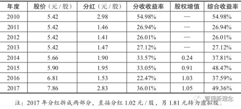 企业所有激励机制的设立,都必须同时配置压力传导机制,否则要么无效,要么最终走向福利化。华为股权激励的奥秘在于两个方面,一是持续的高配股和分红,每年分红收益率基本在25%以上,加上增值后的综合收益率在30%左右(见下表),这么高的投资回报率傻瓜才不配呢!但是高配股需要员工支出大量的资金,自己资金不足时,还需要向亲戚朋友借贷,或向银行等机构融资(2012年起银行不再提供非上市公司股权质押融资),债务负担让员工心无旁骛努力工作。二是饱和配股,你不努力奋斗争取升职,就会停留在顶格线上,眼睁睁地看着别人大把配股、大量分红。