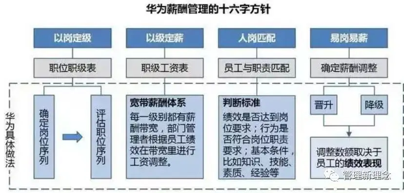 总体来讲,可以用16个字来概括华为的薪酬管理:以岗定级、以级定薪、人岗匹配、易岗易薪。